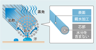 繊維の表面に親水加工を施すことで、優れた吸水力を発揮し、汗を肌から生地へ素早く吸い上げます。また、繊維の芯部は保水しないので、水分が溜まらず体の冷えを防ぎます。さらに、繊維間の微細な隙間が毛細管現象を促進し、吸い上げた汗を素早く広範囲に拡散。ウエア内をドライに保つことで汗冷えを防ぎます。