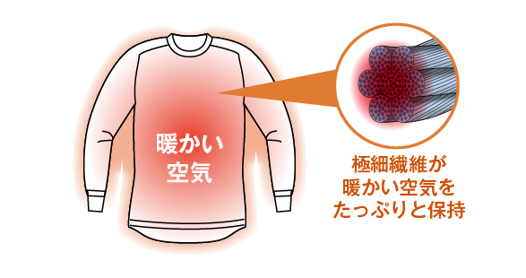 極細繊維の隙間に暖かい空気をたっぷり保持することで、体温を逃がさず、暖かさが持続します。